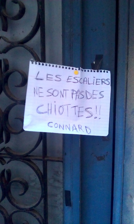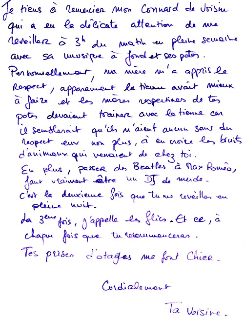 Pour ceux qui ne connaissent pas l’hilarant Tumblr “Chers voisins”, ce flux est consacré a des photos de la riche correspondance que les voisins peuvent entretenir : petits mots doux laissés dans un ascenseur, un hall d’entrée ou une cage d’escaliers. Voici un petit florilège qui devrait vous amuser avant votre mérité repos hebdomadaire.