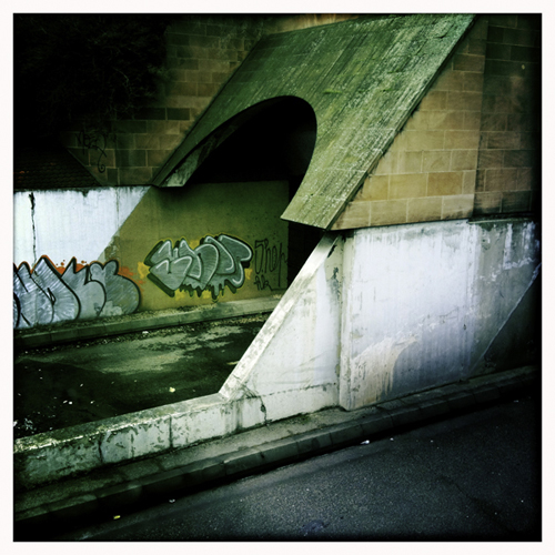 Promenade urbaine dans Strasbourg, où plutôt dans sa périphérie. Un paysage typique du péri-urbain en voie de désertification, entre les autoroutes, les canaux et les bâtiments en attente de destination finale. Sur fond d’hiver et de ciel gris, évidement, un paysage tagué de la tête aux pieds, nouvelle signalétique urbaine pour signifier l’abandon et la réléguation.